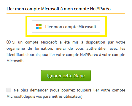 Lors de la toute première connexion à NetYpareo il vous sera demandé de lier votre compte à Microsoft, après avoir modifié le mot de passe par défaut et accepté les conditions d’utilisation de NetYparéo cette fenêtre s’affiche, cliquer sur « Lier mon compte Microsoft » :