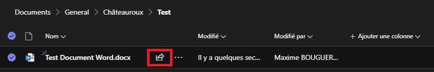 Dans un premier temps il faut récupérer le lien SharePoint du document dans Teams, pour cela il suffit de partager le fichier.