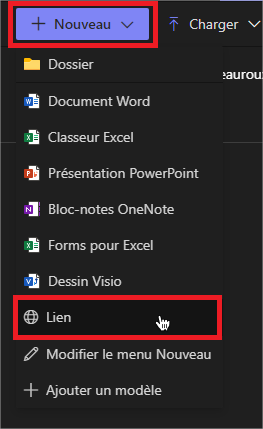 Pour créer le lien du fichier il suffit de se rendre dans le canal qui doit accueillir le lien, de cliquer su nouveau, puis sélectionner "Lien" :