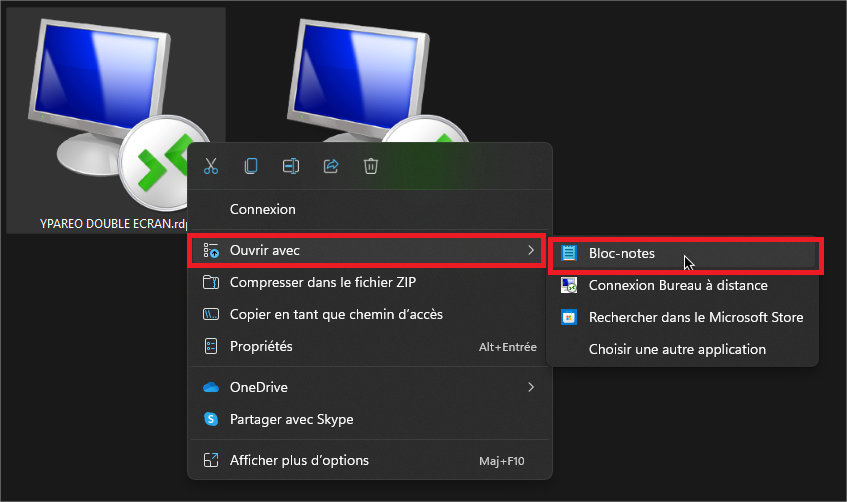 Faire de nouveau un clic droit sur notre raccourci "YPAREO DOUBLE ECRAN" puis "Ouvrir avec" puis "Bloc-notes" :