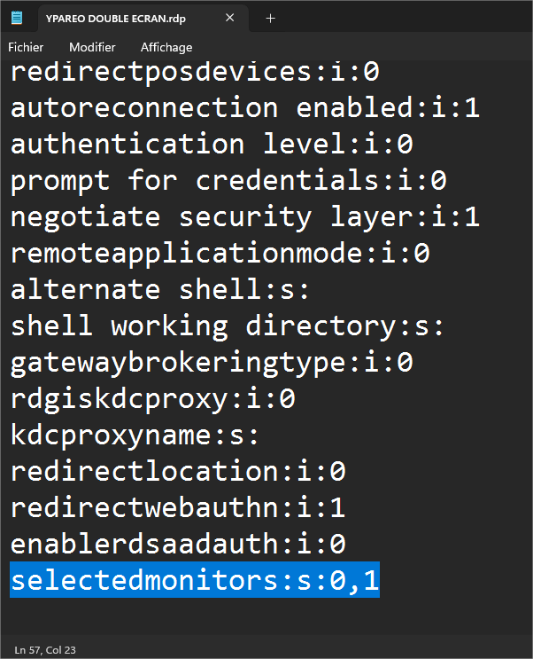 A la fin du fichier ajouter "selectedmonitors:s:0,1" (faire un copier/coller pour éviter les erreurs) :