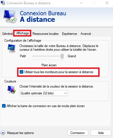 Dans ce nouveau menu aller dans l'onglet "Affichage" puis cocher la case "Utiliser tous les moniteurs pour la session à distance" :