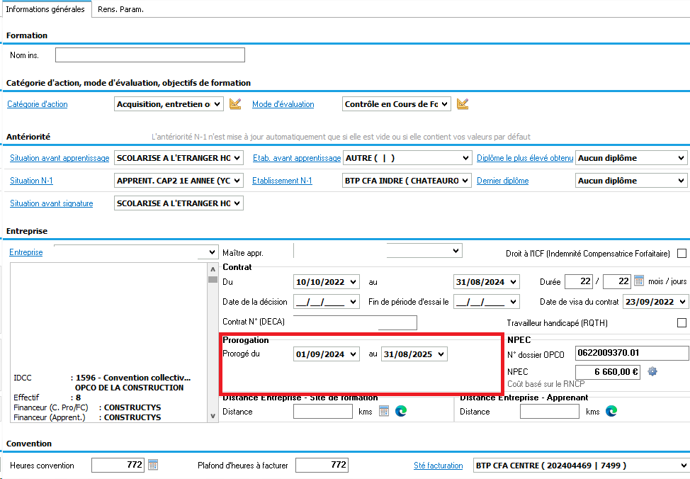 Pour exemple, un apprenant qui n'a pas réussi ses examens en 2023-2024 et doit redoubler son année en 2024-2025 il faut renseigner dans son dernier contrat les dates de prorogation (donc son contrat de 2023-2024) :
